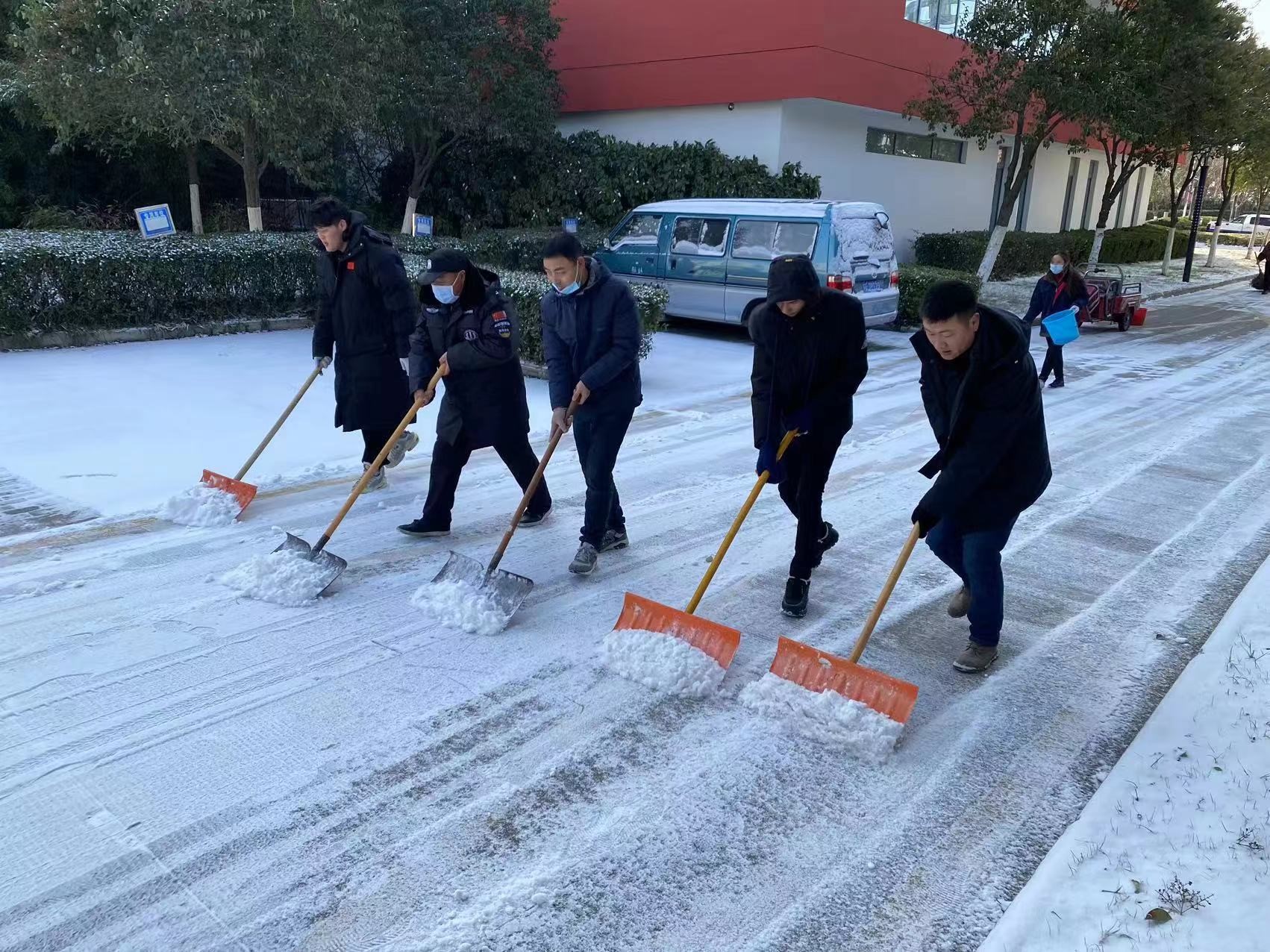 由于夜間雪情,道路積雪結冰,14日夜間,公司啟動應急預案,調(diào)集現(xiàn)場人員,利用掃把、鐵鍬針對各道口、坡道及主要行人路段開展作業(yè),確保各項目道路通行順暢。
