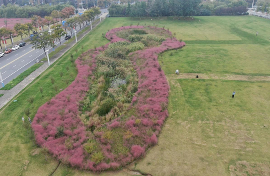 在中央商區(qū),成片的粉黛亂子草正值最佳觀賞期,云霧般的粉色花穗在陽光下輕盈搖曳,已成為市民爭相打卡的“網(wǎng)紅”景點。“粉黛亂子草觀賞性雖高,養(yǎng)護卻需格外精心。”建發(fā)公司相關(guān)負責(zé)人介紹,為維持其最佳觀賞狀態(tài),園區(qū)采取了分區(qū)、分時的精細化養(yǎng)護策略。盛花期期間,養(yǎng)護人員會精準控制澆水量,避免過多水分影響花穗形態(tài);雨季則及時排水,嚴防積水導(dǎo)致爛根。同時,還安排了專人全天巡視,引導(dǎo)游客在指定區(qū)域文明觀賞,并對局部受損區(qū)域?qū)嵤?ldquo;點對點”修復(fù),確保每一株粉黛都能以最美姿態(tài),展現(xiàn)秋天的溫柔與浪漫。