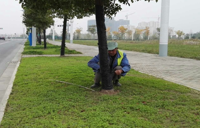 對于耐寒性差的常綠喬灌木如香樟等,進(jìn)行草繩、薄膜裹樹干防凍保護(hù)處理;對于落葉喬灌木,進(jìn)行樹干涂白處理,減小樹木晝夜溫差、防止樹木凍裂,并能起到殺菌、滅蟲的功效。