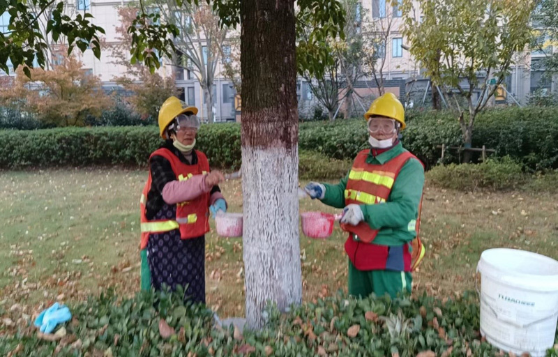 綠化樹木涂白是園林綠化養(yǎng)護(hù)作業(yè)工作中一項(xiàng)重要內(nèi)容,涂白主要采用石灰、硫酸銅和水混合而成,可以有效減少對(duì)綠化樹木水分的蒸發(fā),增加綠化樹木的抗凍、抗病、抗蟲的機(jī)理功能,同時(shí)具備防護(hù)、殺菌、殺蟲的多重作用。為提高綠化樹木涂白的整體質(zhì)量和視覺效果,綠化養(yǎng)護(hù)工人采用“拉線涂白法”或“立桿涂白法”,保證涂白上口齊平、高度一致、涂刷均勻,確保綠化苗木涂白后效果與環(huán)境形成美化作用。